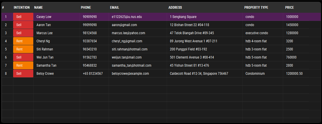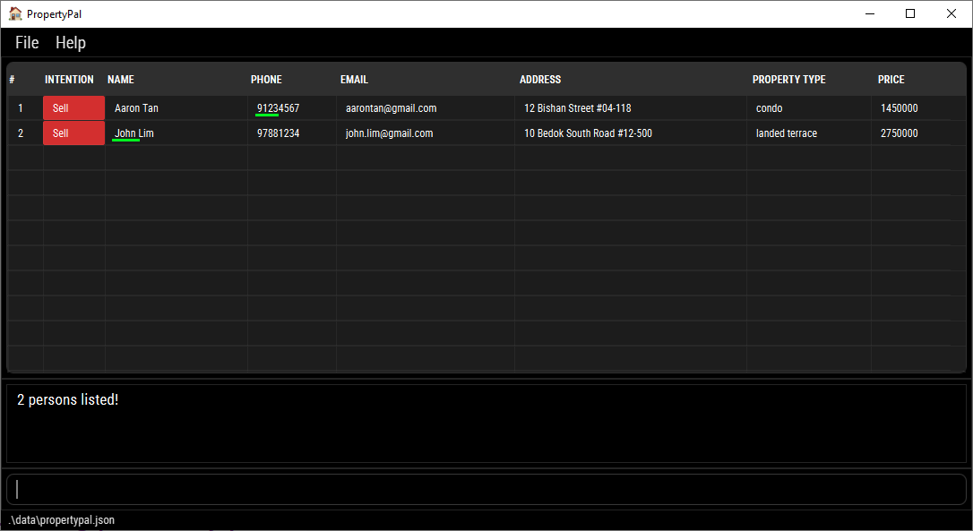 | Add | add i/INTENTION n/NAME p/PHONE_NUMBER e/EMAIL a/ADDRESS pt/PROPERTY_TYPE pr/PRICE e.g., add i/sell n/James Ho p/22224444 e/jamesho@example.com a/123, Clementi Rd, 1234665 pt/HDB 3 room flat pr/470000 |
