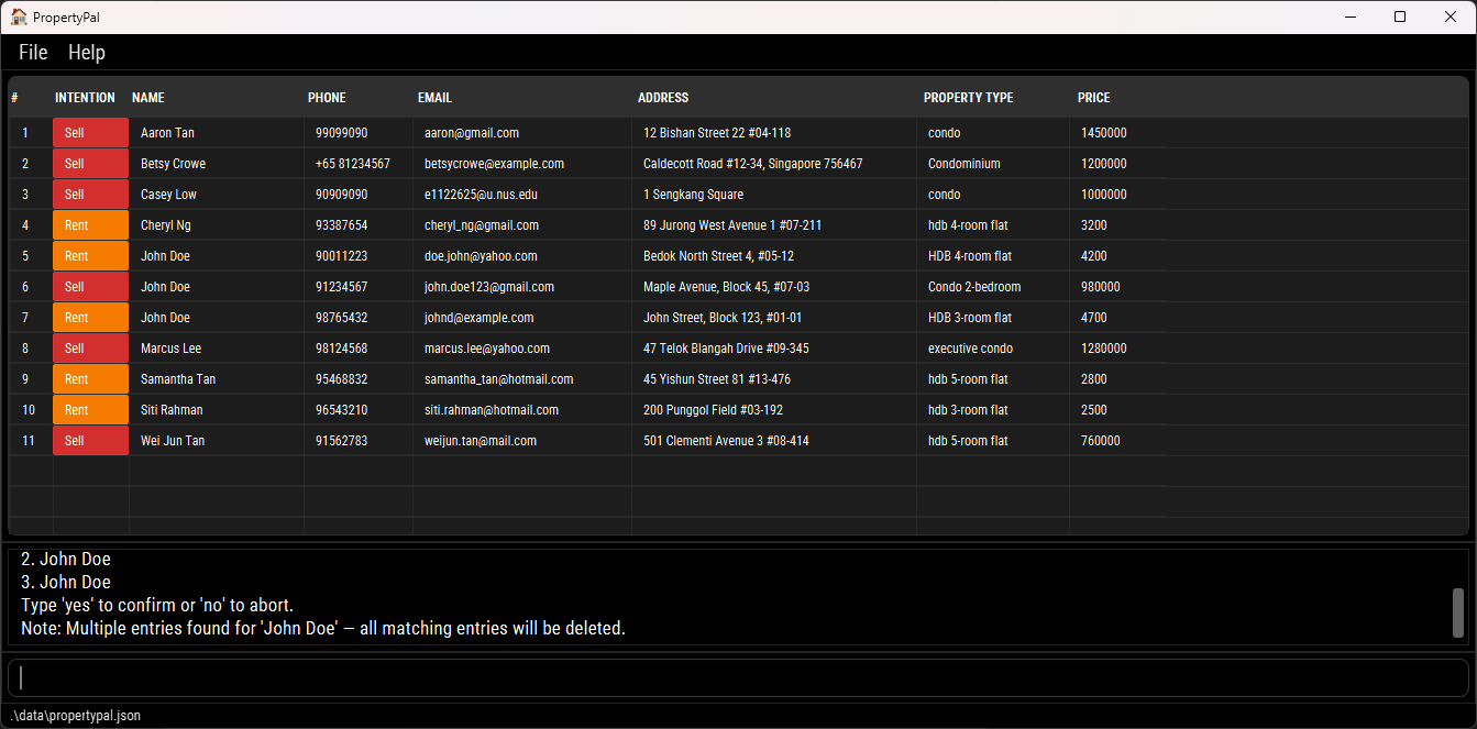 INDEX, OR one or more persons by exact NAME(s). Do not mix index and names in the same command.NAME to delete (e.g., delete n/John Doe), PropertyPal will match and delete all persons whose full name exactly matches John Doe (case-insensitive). If the name matches multiple entries, the application will display a confirmation warning listing all matched entries and append a note such as: