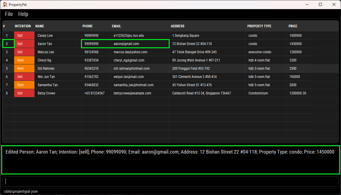 | Edit | edit INDEX [n/NAME] [p/PHONE_NUMBER] [e/EMAIL] [a/ADDRESS] [pt/PROPERTY_TYPE] [pr/PRICE]e.g., edit 2 n/James Lee e/jameslee@example.com |